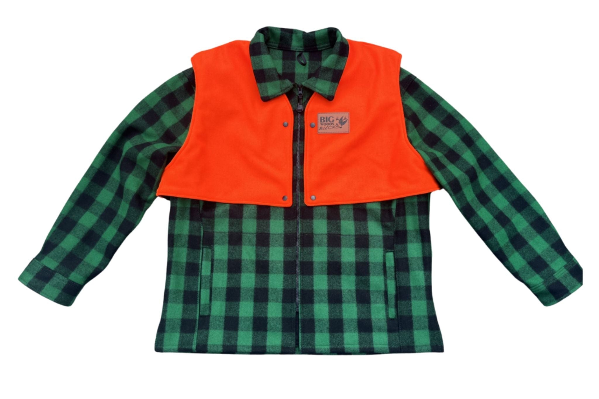 The Big Woods Bucks Tracker Jacket is designed to be your quintessential wool hunting outerwear. With our signature green checker 100% American-made 22 oz. virgin wool, a removable wool blaze orange cape, and a game pocket in the rear, it's built for the big woods.