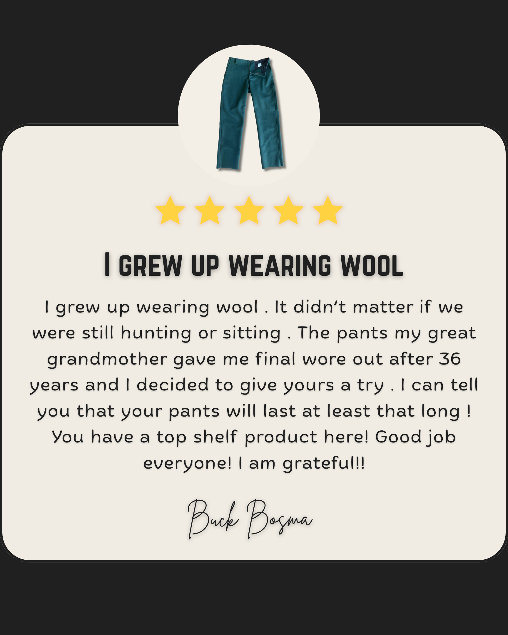 Wool is naturally tough and abrasion resistant. It doesn’t melt from sparks, snag like ultralight synthetics, or get shiny with wear. Many customers are still hunting in pieces they bought decades ago.