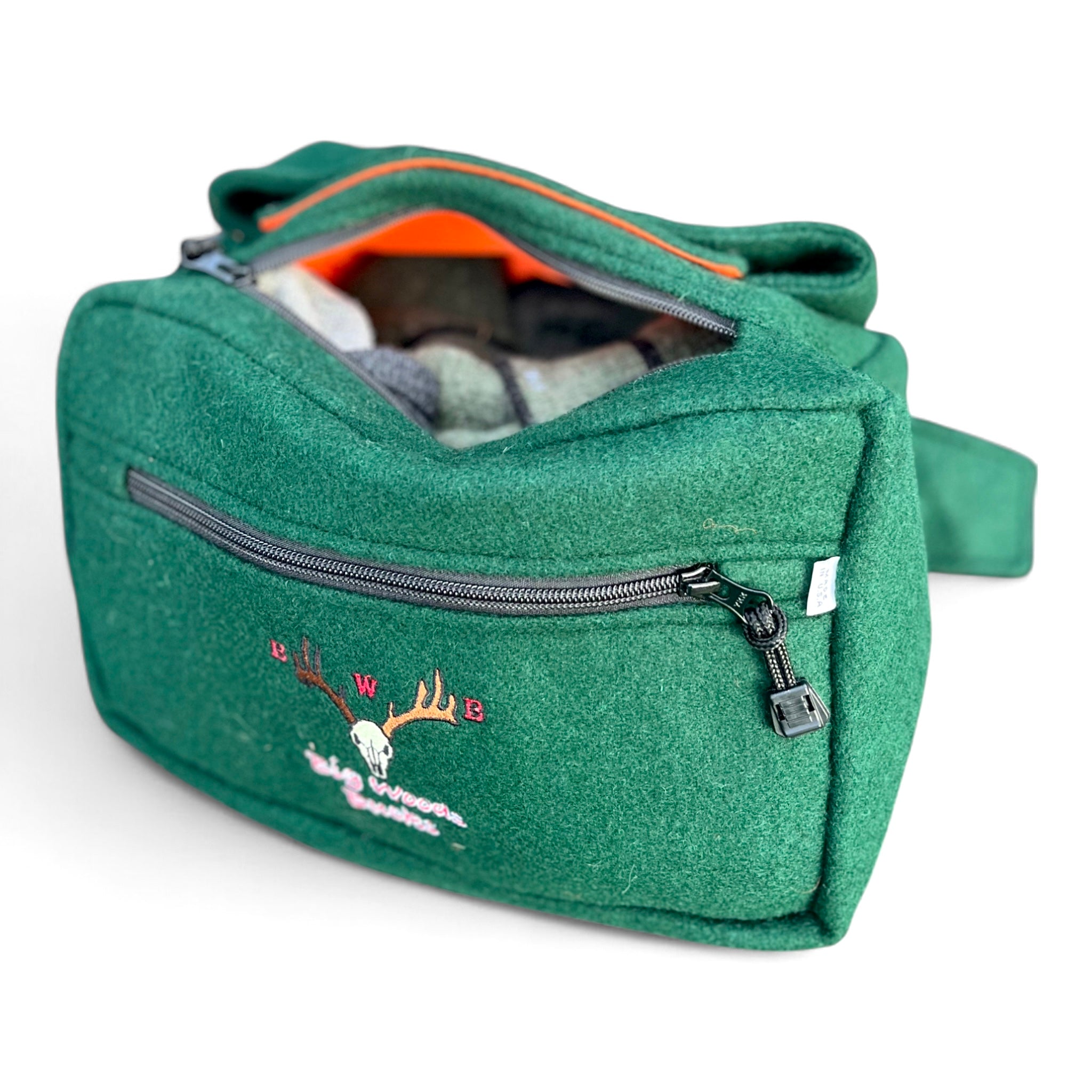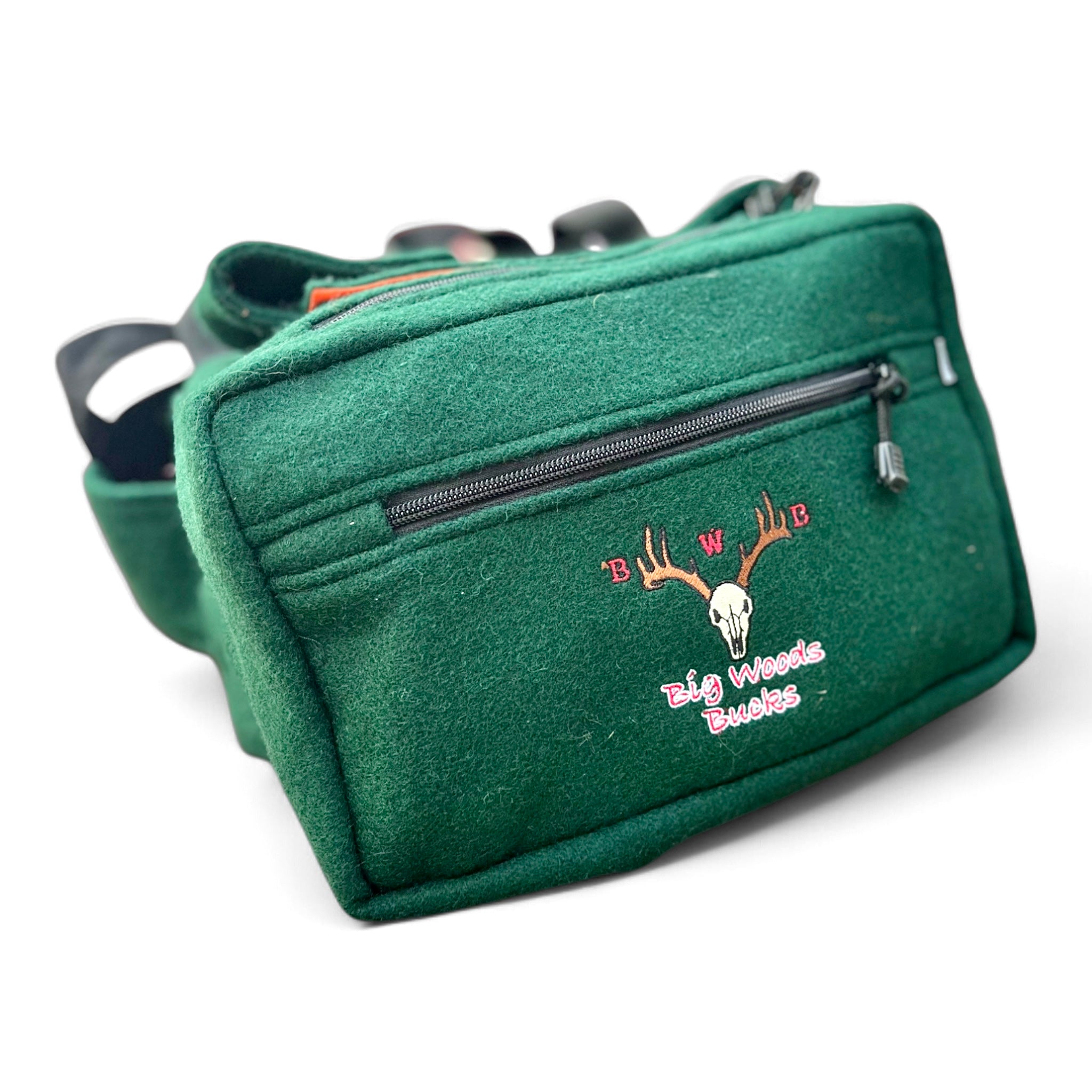 This wool fanny pack can be used for all applications of hunting, fishing, camping, hiking or geocaching. Its exterior shell is made from quiet and durable 22 oz. pre-shrunk virgin wool. It has two compartments lined with treated nylon material that is water repellent to ensure the contents of the pack will stay dry no matter what weather you might experience. Field tested and proven tough by the Big Woods Bucks Team. This is the last pack you will ever have to buy!
